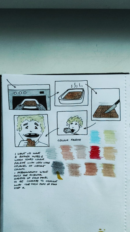 In this series of illustrations I have begun to refine my style and think about a suitable colour palette. The colour palette I have chosen to opt for consists of rather muted, warm tones primarily, with an odd hint of more vibrant colours to brighten up the otherwise fairly bland nature of the whole illustration. The one thing I want to highlight in each panel/illustration is only the essential part of the steps, which I plan on doing by leaving the non-essential parts of the imagery colourless to emphasize the task at hand.