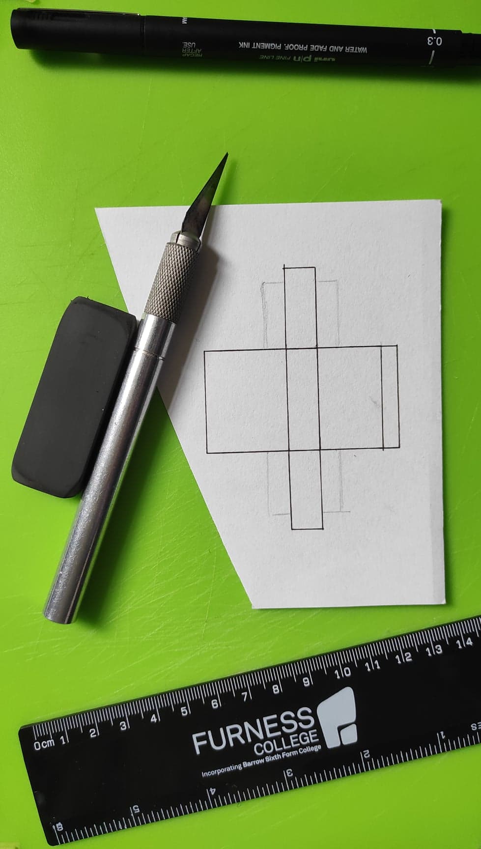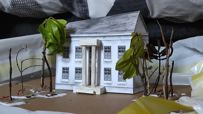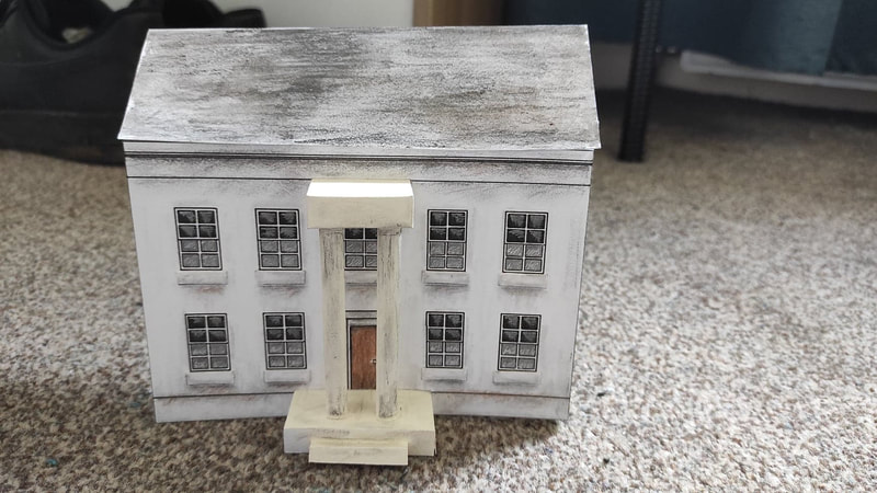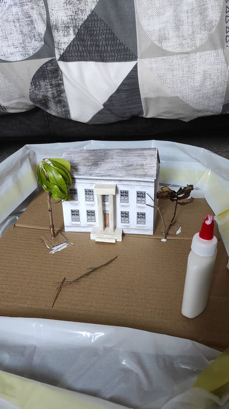 I've begun experimenting with creating 3D models now. Since I'm likely wanting to create a full outdoor scene of the house and surrounding environment, I've first created a very simple model of the house's exterior using thin white card. For this I had to essentially create my own origami design which I could fold into the correct shape and have interlocking joins in places. For an extremely basic construction, the result isn't too bad, however the strength and robustness of it needs to be much better as it is prone to warping with such thin material. The interlocking technique I used on the additional pillar piece proved to be very strong however and this is definitely something which I'll have to use more frequently to ensure my model is stable. Doing this also means the need for adhesives isn't necessary to stick things together. And obviously if I was creating my actual final model it would need to be infinitely more detailed and layered.