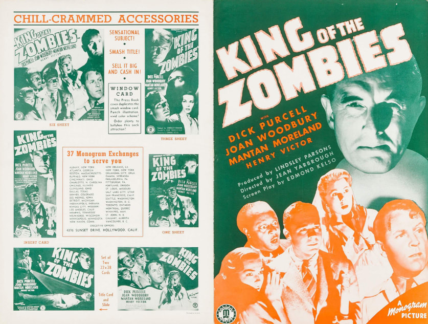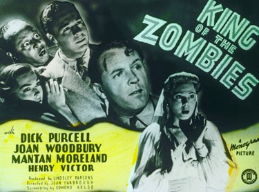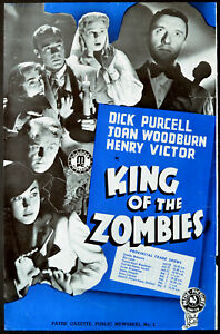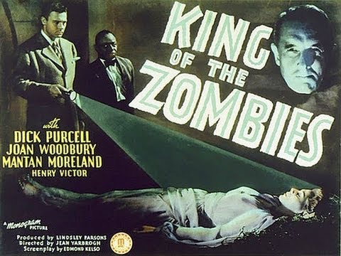 'King of the Zombies' Initial release date; 14 May 1941 Director; Jean Yarbrough Screenplay; Edmond Kelso Nominations; Academy Award for 'Best Music' Cast; Dick Purcell as 'James 'Mac' McCarthy' Jon Archer as 'Bill Summers' Mantan Moreland as 'Jefferson 'Jeff' Jackson' Henry Viktor as 'Dr. Miklos Sangre' Joan Woodbury as 'Barbara Winslow' Background; Inspired by the success of the film 'The Ghost Breakers' in 1940, 'king of the Zombies was announced in January of 1941. It is an American zombie comedy film directed by Jean Yarbrough, Dick Purcell, Joan Woodbury and Mantan Moreland. Produced by Monogram Pictures, it was very much typical of its 'B Films' at the time. In 1943, a sequel was released under the alias of 'Revenge of the Zombies' which included two of the original cast members. Plot; In 1941, captain James 'Mac' McCarthy pilots a Capelis XC-12 airplane flying between Cuba and Puerto Rico when the plane begins running out of fuel and is blown of course by an incoming storm. Unable to pick up any radio signal over the Caribbean, he suddenly hears a brief transmission from what he assumes is a nearby island. After crash-landing on this remote island, McCarthy and his crewmates Bill Summers and Jefferson Jackson soon take refuge in a nearby mansion, courtesy of Dr Miklos. Sangre. The witty servant (Jefferson Jackson) soon notices odd happenings within the home and begins to be convinced that the house is haunted by zombies. The 2 crew-members and their servant enlist the help of Barbara Winslow as they go in search of the mysterious events going on in the mansion. While exploring, they stumble upon a voodoo ritual in the basement, being conducted by the doctor himself, who in actuality is a foreign spy attempting to gather intelligence from a captured US admiral who had also previously crash-landed on the island. McCarthy succumbs to the doctor's spell, however Summers soon comes to his aid, interrupting the ceremony just as Barbara is about to reveal information. This causes the zombies to turn on their master (the doctor). The doc shoots McCarthy multiple times but gets forced backwards into a fire-pit by the zombies and subsequently dies. Now, with the doctor dead, the zombies are released from their spells. |