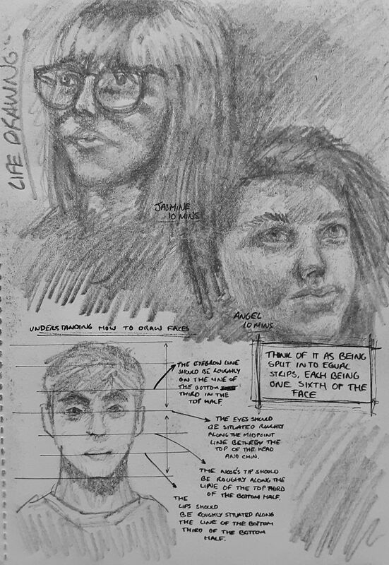 Moving on to portraits I've experimented with various methods of life drawing, even including no-look ones. Taking notes from the lecture, I've also drawn a diagram of how the human face should be split into equal proportions. These sketches demonstrate varying lengths of time for each drawing.