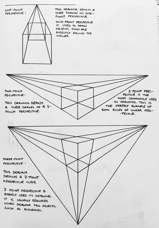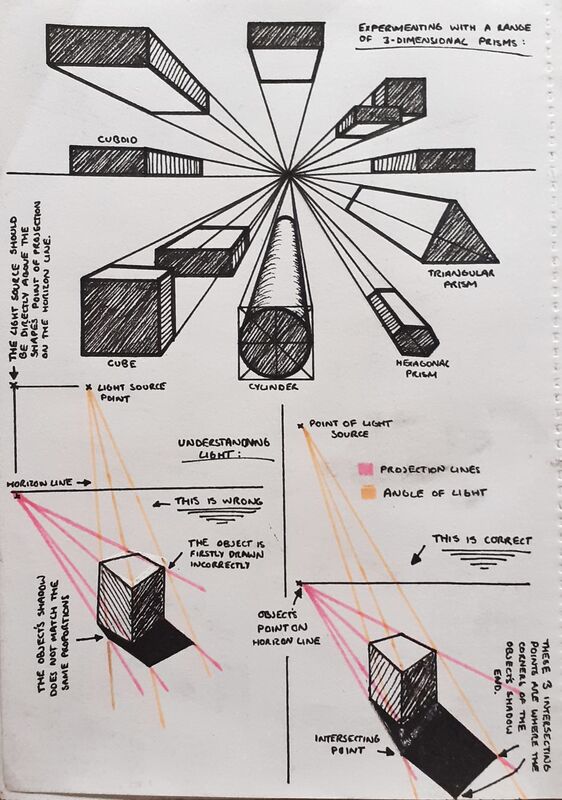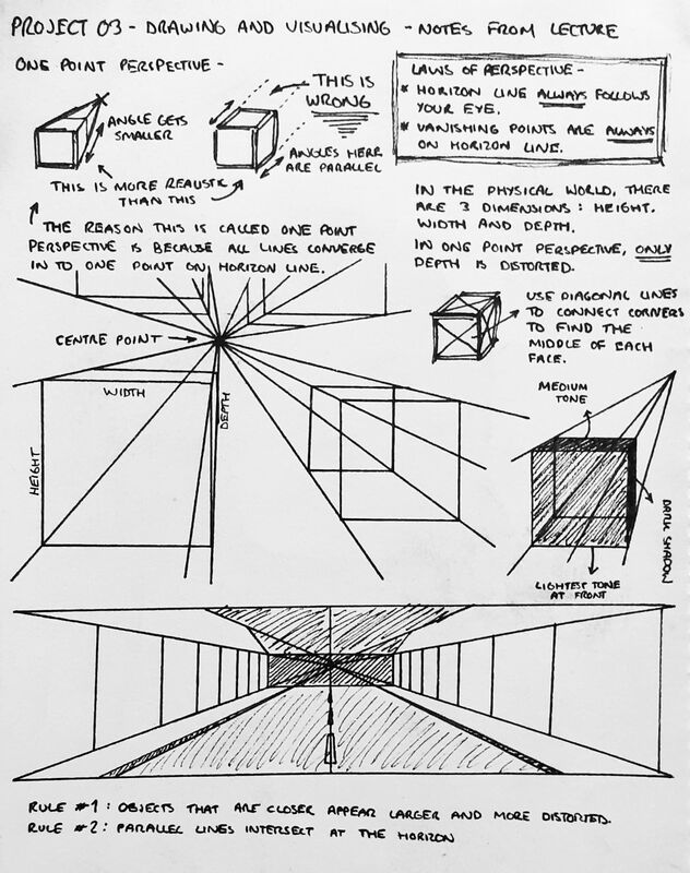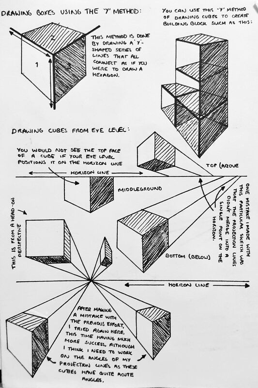 Here are some notes I made during the lecture, from which I've developed my own understanding of the different types of perspective, much of which has involved a steep learning curve, evident here in my experimentation where you can see some things clearly just haven't worked properly the first time.