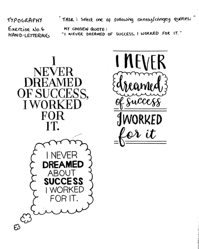 The first one, in keeping with the aforementioned idea of business, structure and perfection almost identically replicates my hand-drawn example, but since I kept that one relatively minimal and monochrome, I wanted to follow through with that here too. This is my favourite of all of them as I think the Serif font and central format of the text being in a 1:1 ratio really just enhances the mood of it. The second on (in the middle) is a little more street inspired compared to those I've done before, but in keeping with my hand-drawn work beforehand, I used the same idea of bold-facing the words 'dreamed' and 'success' to enhance their presence. I used a standard capitalised Arial type-face in this example and set it against a white square situated further towards the corner, allowing the focal point of the image underneath to sit in the adjacent corner. I did this because I wanted to sort of tell a story as if you were looking out of that window in the photograph at your dreams, which in this case is represented by the dream-like sunrise. The third one (on the right) is my least favourite of all, mostly because it lacks structure, however I'd seen a similar type of text organisation online and so coupled that to my own image. Much like the previous example, I used a similarly toned sunset shot with a long exposure to capture that dream-like essence of the quote. In a similar fashion yet again, I've also emphasised the words 'dreamed' and 'success', not in block capitals this time, but rather with the use of a larger font and different colours. Taking away from this experimentation, I may have to explore further with the idea of using text and imagery in conjunction with one another to see if the two can combine to create a type-face or to enhance different words. The task here was to create several hand-drawn variations of our chosen cheesy quote, mine which I picked out to be "I never dreamed of success, I worked for it." I kept my ideas fairly simple here going off the fact there was very little imagery that would be appropriate alongside the quote.