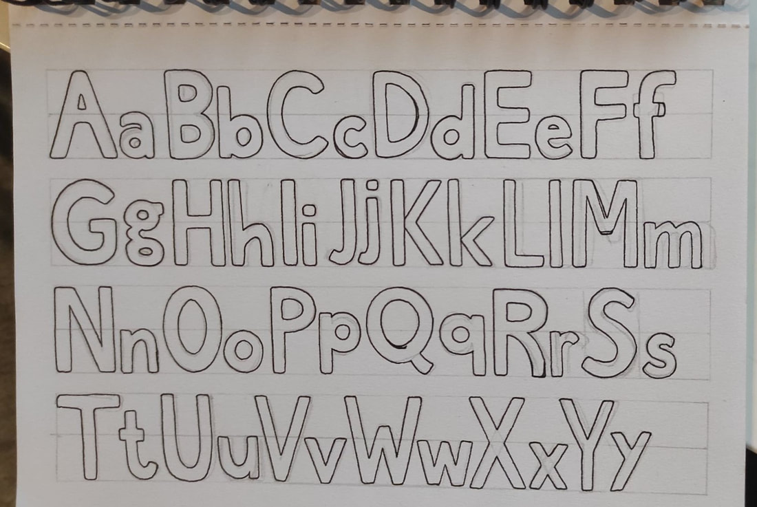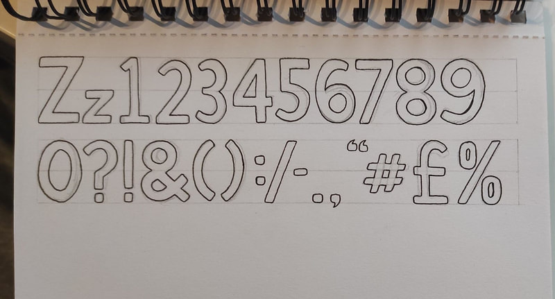 Here I've begun progress on creating my final alphabet outcome. I've stuck to a simple format of both capital and lowercase lettering for each character and then following on from that, also included the numbers 0-9 as well as various common symbols and accents. The font as previously mentioned is entirely in a sans-serif format, very similar to the bold Calibri style.