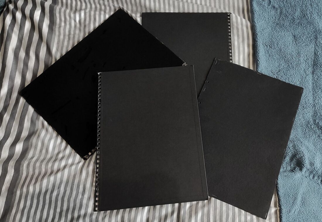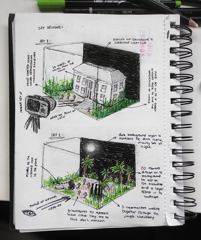 As I was searching for things to use, I came across my collection of old sketchbooks of various sizes, A3, A4 & A5. Anything above A3 would be too small to work with and photograph, so I gathered a few A3 ones and begun taking the covers of them as they were matte black in most cases, ideal for what I'm trying to achieve. Once I'd taken the four covers off, I had all the panels I needed to create a rectangular box. The three panels you see in the second image are held together simply from behind with tape, so they can be collapsed easily when needing to move my set and for storage purposes. The top panel does not need to be attached at all as it can just rest on top of the box already there. Although having a roofing panel might seem silly and awkward to work with, it acts as a medium to block out the light, thus darkening the set even further. Also, if and when I need to add text to the set, it can hang freely from above without any complexity. I've started creating some initial thumbnail sketches trying to gather ideas on subject matter and composition. A lot of the posters I'd seen for the actual film were very contrasty and dark, appropriate considering the films nature, and I am trying to go for a similar thing here. Choosing a subject matter has been particularly challenging however, as the original posters featured the plain old characters and nothing else. I've taken a different approach here and made my examples more relative to the film's title and storyline including things such as a graveyard, zombies and their crashed plane, all of which are viable ideas. At present, I'm leaning towards creating a more scenic model of the exterior of the mansion they come across and the surrounding environment of shrubbery and jungle. I would've ideally liked something more symbolic and typical of zombie films, however since the zombies in this film feature no gore, blood or torn clothing etc like your stereotypical ones, I'll have to shift my focus more towards the storyline in this instance.