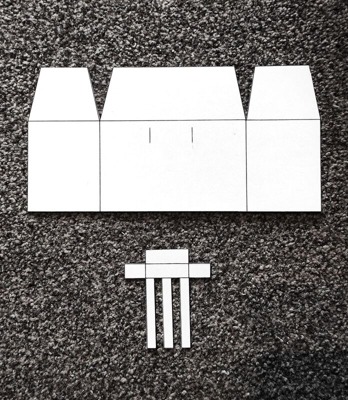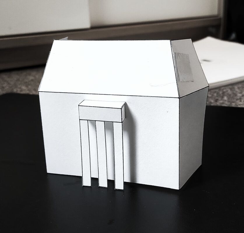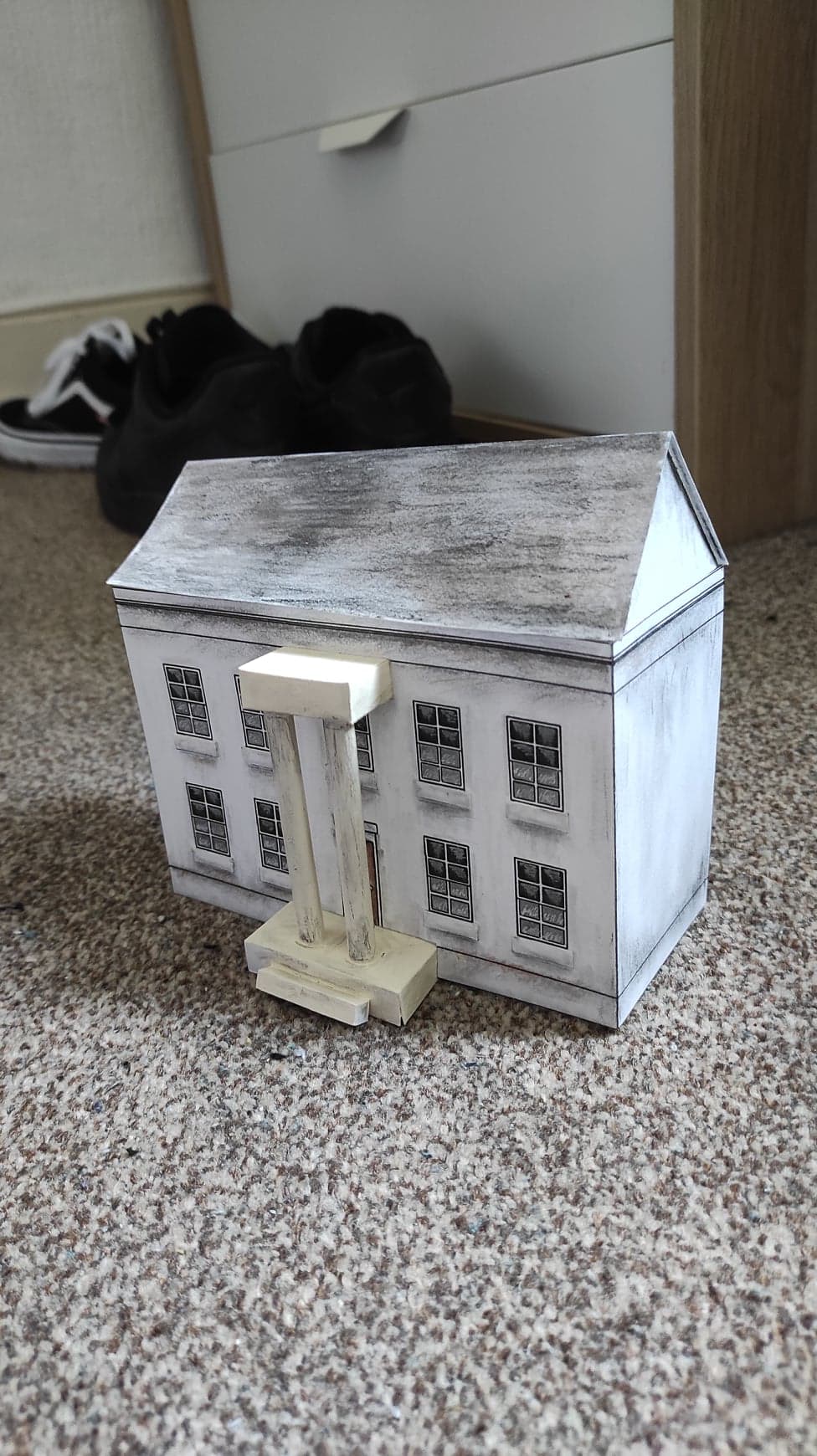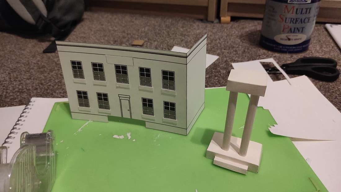I've begun experimenting with creating 3D models now. Since I'm likely wanting to create a full outdoor scene of the house and surrounding environment, I've first created a very simple model of the house's exterior using thin white card. For this I had to essentially create my own origami design which I could fold into the correct shape and have interlocking joins in places. For an extremely basic construction, the result isn't too bad, however the strength and robustness of it needs to be much better as it is prone to warping with such thin material. The interlocking technique I used on the additional pillar piece proved to be very strong however and this is definitely something which I'll have to use more frequently to ensure my model is stable. Doing this also means the need for adhesives isn't necessary to stick things together. And obviously if I was creating my actual final model it would need to be infinitely more detailed and layered.