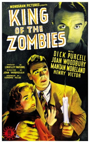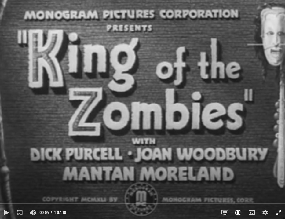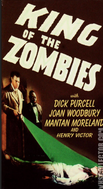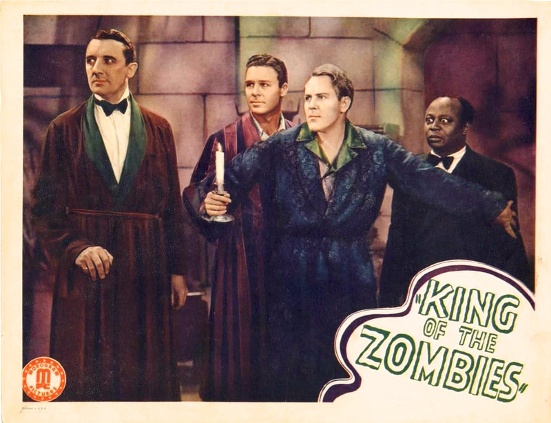 'King of the Zombies' Initial release date; 14 May 1941 Director; Jean Yarbrough Screenplay; Edmond Kelso Nominations; Academy Award for 'Best Music' Cast; Dick Purcell as 'James 'Mac' McCarthy' Jon Archer as 'Bill Summers' Mantan Moreland as 'Jefferson 'Jeff' Jackson' Henry Viktor as 'Dr. Miklos Sangre' Joan Woodbury as 'Barbara Winslow' Background; Inspired by the success of the film 'The Ghost Breakers' in 1940, 'king of the Zombies was announced in January of 1941. It is an American zombie comedy film directed by Jean Yarbrough, Dick Purcell, Joan Woodbury and Mantan Moreland. Produced by Monogram Pictures, it was very much typical of its 'B Films' at the time. In 1943, a sequel was released under the alias of 'Revenge of the Zombies' which included two of the original cast members. Plot; In 1941, captain James 'Mac' McCarthy pilots a Capelis XC-12 airplane flying between Cuba and Puerto Rico when the plane begins running out of fuel and is blown of course by an incoming storm. Unable to pick up any radio signal over the Caribbean, he suddenly hears a brief transmission from what he assumes is a nearby island. After crash-landing on this remote island, McCarthy and his crewmates Bill Summers and Jefferson Jackson soon take refuge in a nearby mansion, courtesy of Dr Miklos. Sangre. The witty servant (Jefferson Jackson) soon notices odd happenings within the home and begins to be convinced that the house is haunted by zombies. The 2 crew-members and their servant enlist the help of Barbara Winslow as they go in search of the mysterious events going on in the mansion. While exploring, they stumble upon a voodoo ritual in the basement, being conducted by the doctor himself, who in actuality is a foreign spy attempting to gather intelligence from a captured US admiral who had also previously crash-landed on the island. McCarthy succumbs to the doctor's spell, however Summers soon comes to his aid, interrupting the ceremony just as Barbara is about to reveal information. This causes the zombies to turn on their master (the doctor). The doc shoots McCarthy multiple times but gets forced backwards into a fire-pit by the zombies and subsequently dies. Now, with the doctor dead, the zombies are released from their spells. |